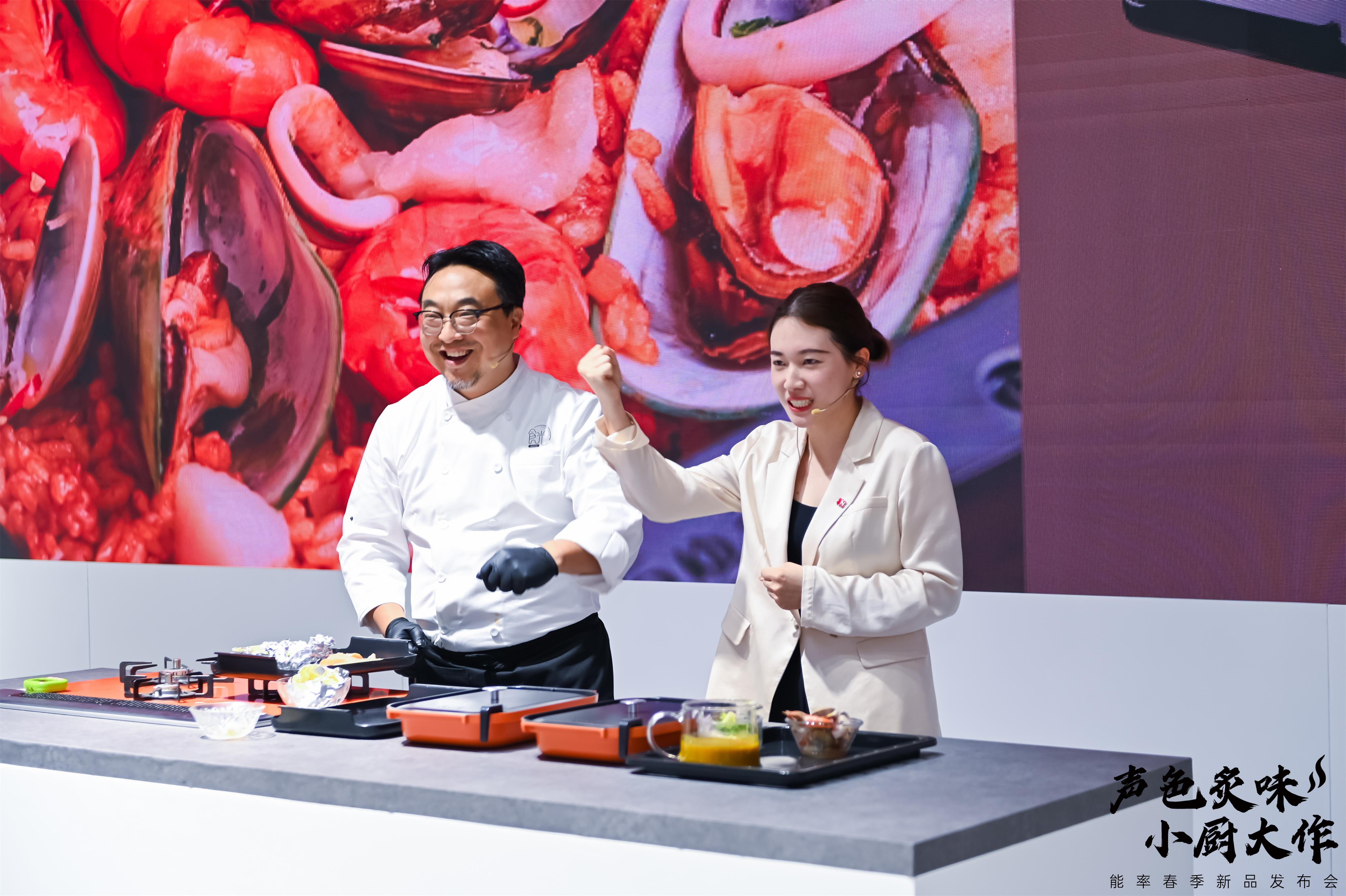 為了讓觀眾更深切地感受能率新品的魅力,現(xiàn)場還開啟了一場色香味俱全的烹飪之旅。上??倧N聯(lián)盟創(chuàng)始金牌會員、星尚頻道《人氣美食》嘉賓主持顧超與能率 (中國)投資有限公司市場部副部長程云霞共同制造豐盛美食,頂尖的廚藝在能率日式料理中心的助力下,讓明火烤制的美味更上一層樓。