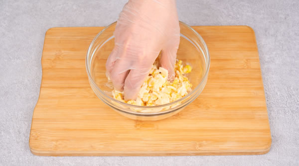 STEP 01將芝士片撕碎,加入玉米粒、25g芝士碎、50g色拉醬拌勻 -