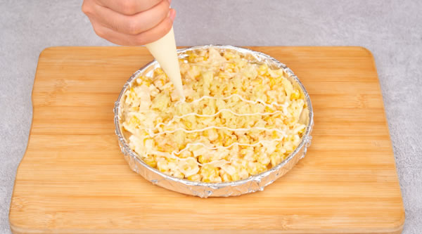 STEP 02圓錫紙盤底部抹黃油,鋪上拌好的玉米粒,頂部撒上10g芝士碎,擠上20g線狀色拉醬 -