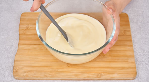 STEP 03將1/3蛋白霜加入蛋黃糊中用軟刮刀拌勻,再倒回剩余的蛋白霜中翻拌均勻 -