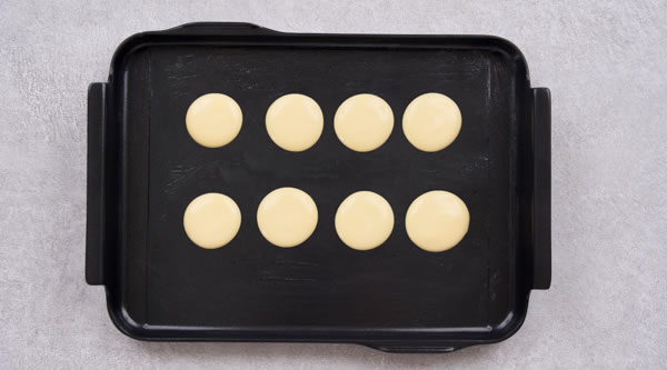 STEP 06用硅膠刷均勻?qū)ⅫS油抹開使其融化,擠入一個(gè)個(gè)圓形銅鑼燒糊 -