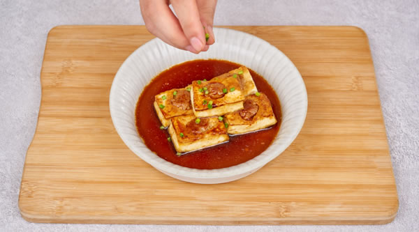將調(diào)味后的豬肉餡釀入鹵水豆腐中煎烤,最后淋入特調(diào)醬汁,表皮微焦,內(nèi)里鮮嫩,鮮香入味。
