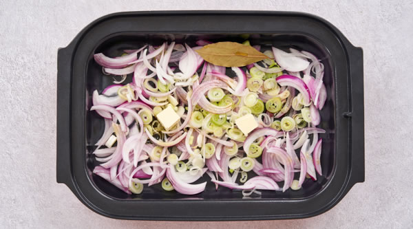 STEP 03在深盤中放入月桂葉、洋蔥絲、京蔥絲、橄欖油和黃油 -
