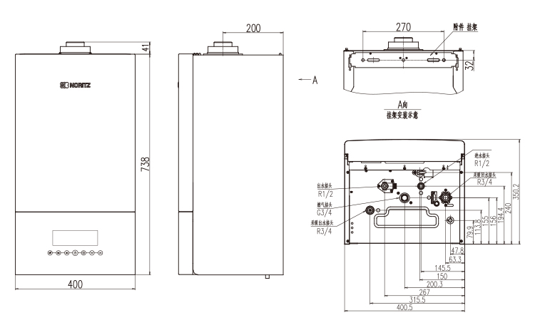 采暖(℃)進(jìn)水出水接口:R3/4”