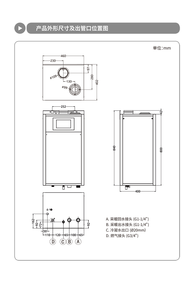 接口:燃?xì)猓篏3/4”、采暖(℃)進(jìn)水出水:G1-1/4”、冷凝水口(mm):?20