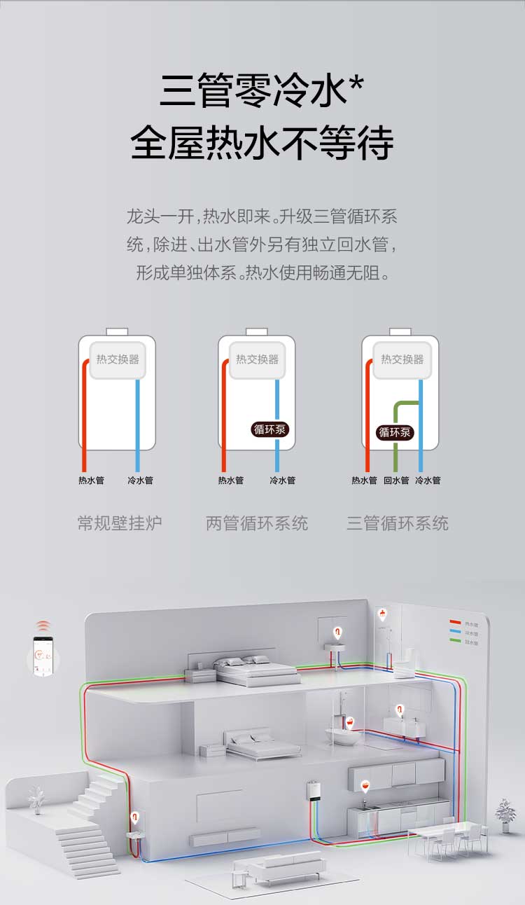 • 三管零冷水系統(tǒng),全屋熱水不等待
