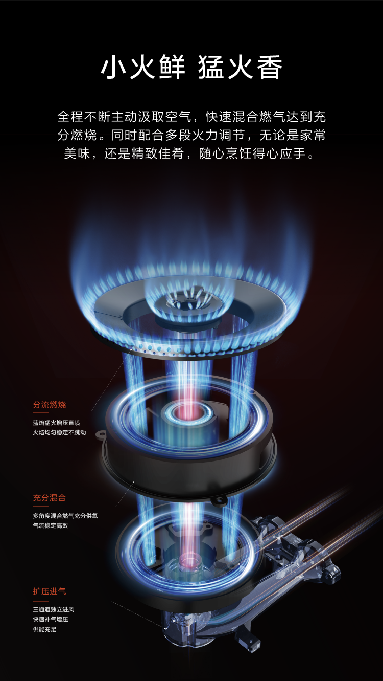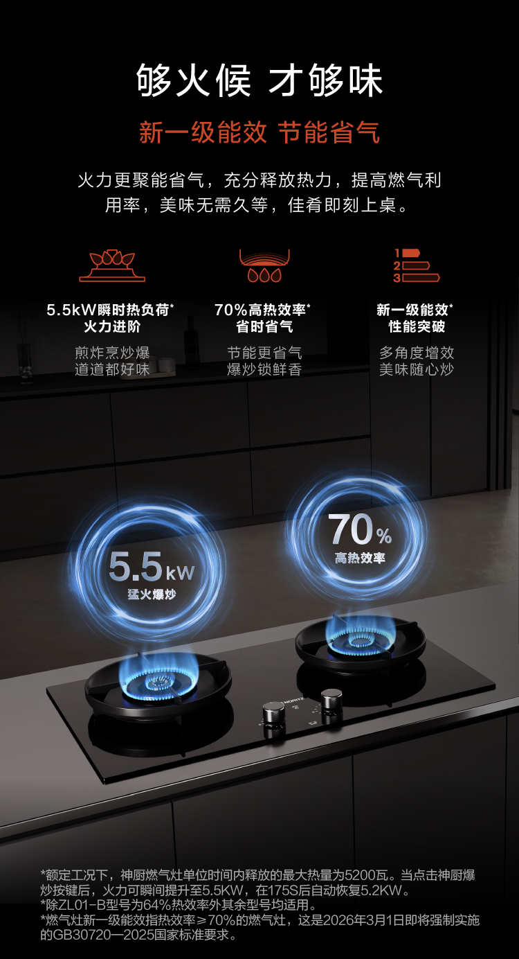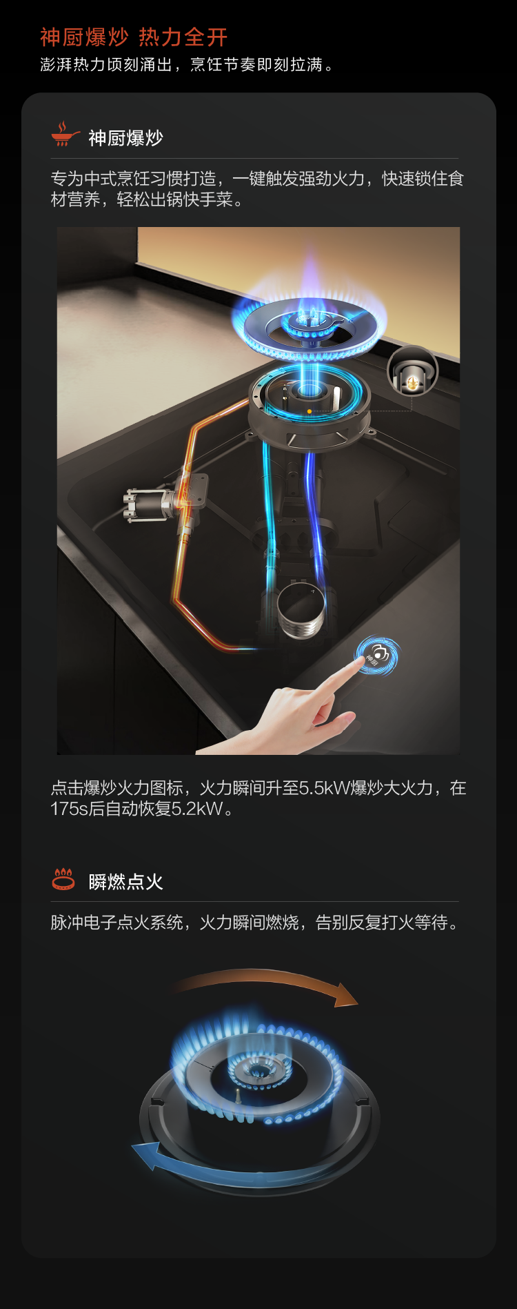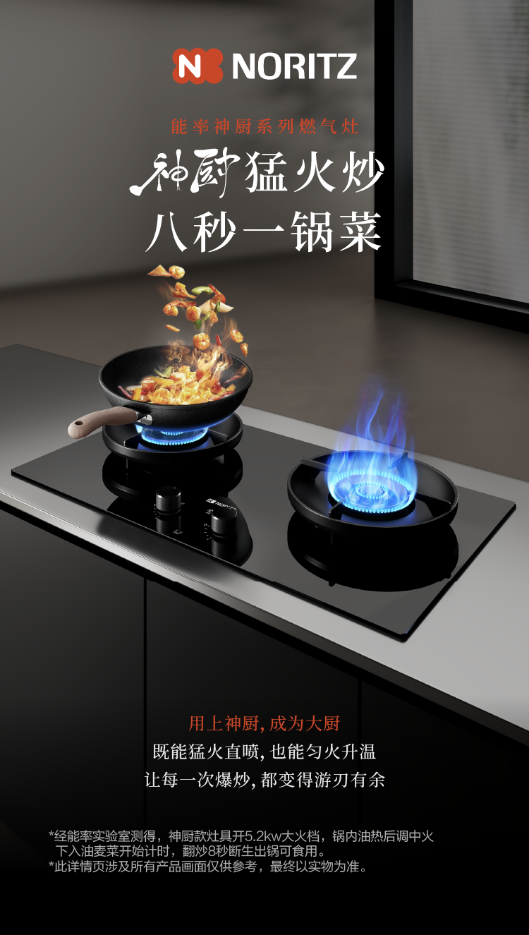 • 神廚猛火炒,最大熱負(fù)荷可達(dá)5.5KW